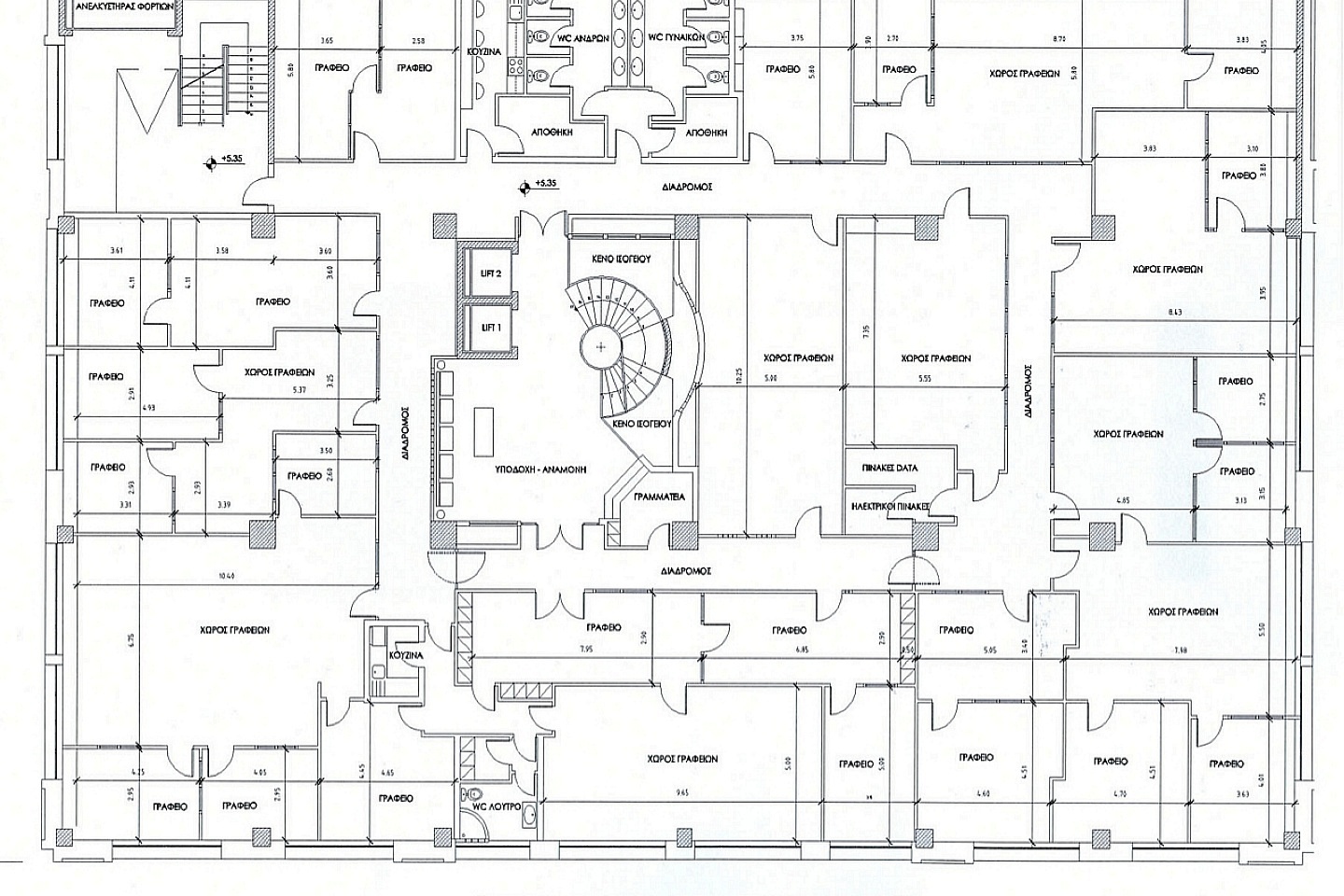 Το υπόγειο είναι 1.000 τετραγωνικών περίπου, με 20 θέσεις στάθμευσης και βοηθητικούς χώρους. Το ισόγειο είναι 1.150 τετραγωνικών, με ύψος 5 μέτρα περίπου. Διαθέτει μεγάλο φωτεινό χώρο υποδοχής, 2 ασανσέρ, μεγάλη στρογγυλή σκάλα η οποία επικοινωνεί με τους επάνω ορόφους. Επίσης διαθέτει έξοδο κινδύνου. Στον ημιώροφο υπάρχουν χώροι γραφείων 600 τετραγωνικών. Ακολουθεί ο πρώτος όροφος ο οποίος είναι 1.190 τετραγωνικών. Τα γραφεία είναι πλήρως ανακαινισμένα, με ψευδοροφές, χωρίσματα από γυψοσανίδες, αλουμίνια και γυαλί. Διαθέτουν όλες τις σύγχρονες παροχές, φωτισμό, καλωδίωση, εξαερισμό, κλιματισμό. Επίσης είναι ευήλια.