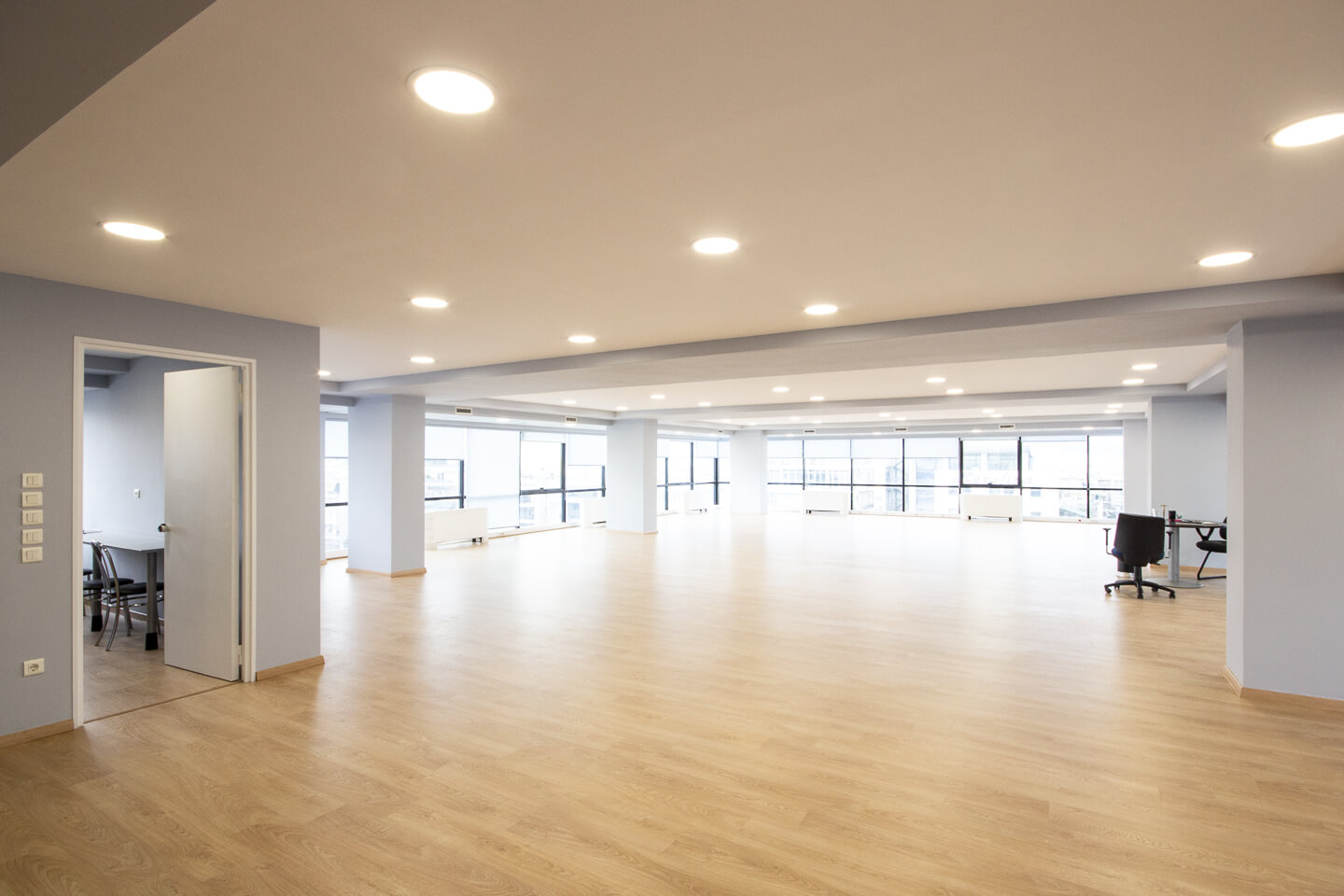 Αποτελείται δε, από open plan εργασιακούς χώρους, κουζινάκι, WC και σύγχρονες εγκαταστάσεις όπως δομημένη καλωδίωση, τριφασικό ρεύμα, εγκαταστάσεις για υπολογιστές, κεντρική θέρμανση fankoil, διπλά τζάμια - κουφώματα αλουμινίου κλπ.