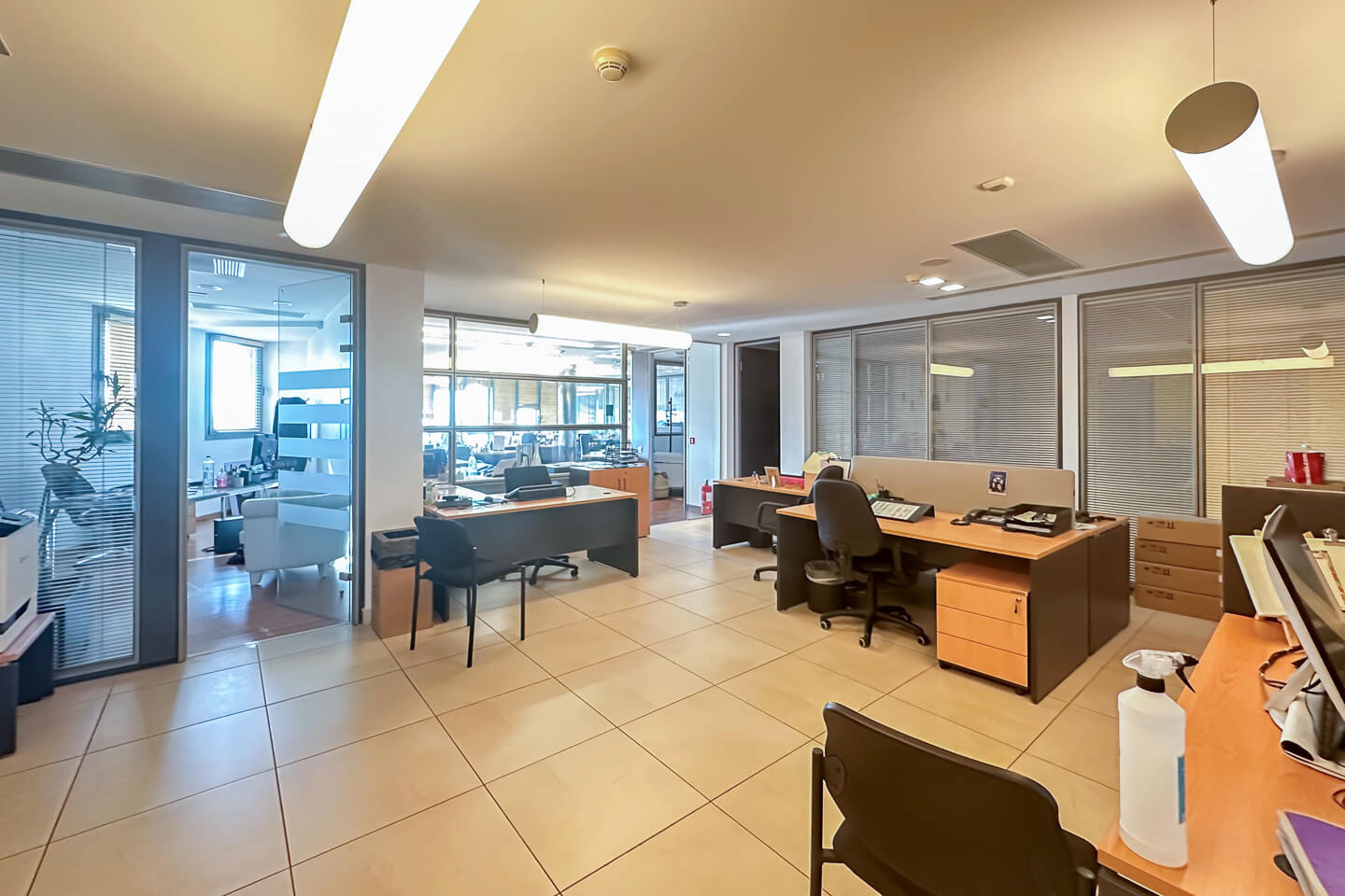Αναλυτικότερα, το ακίνητο διαθέτει reception, meeting rooms, διευθυντικό γραφείο, φωτεινούς open space χώρους εργασίας με κινητά χωρίσματα, κλειστά γραφεία, καφετέρια, κουζίνα και τουαλέτες. Οι ψευδοροφές είναι από γυψοσανίδα και τα δάπεδα laminate και πλακάκι.