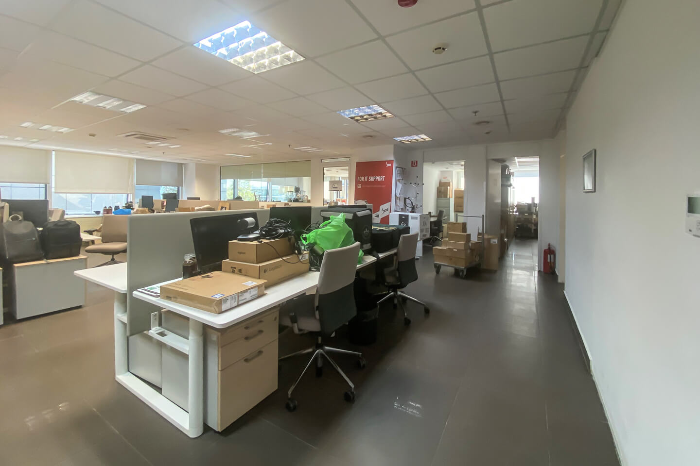 Τα γραφεία στεγάζονται στον 3ο όροφο και διαθέτουν ρεσεψιόν, γυάλινα κινητά χωρίσματα που προσαρμόζονται στις ανάγκες των πελατών, ψευδοροφή ορυκτής ίνας, κουζίνα και WC με αδιάβροχη ψευδοροφή.