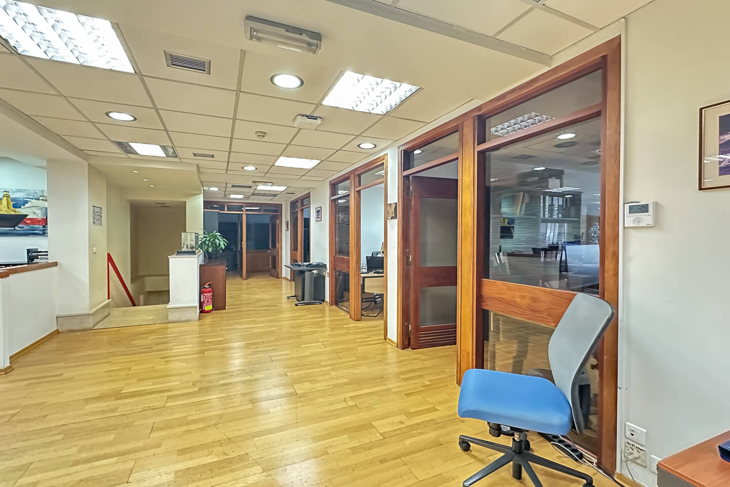 Αναλυτικότερα, το ακίνητο αποτελείται από reception, meeting room, server room, φωτεινούς open space χώρους εργασίας με γυάλινα κινητά χωρίσματα, κλειστά γραφεία, αποθήκη, κουζινάκι και wc σε κάθε όροφο. Οι ψευδοροφές είναι ορυκτής ίνας και τα δάπεδα είναι laminate και ξύλινα.