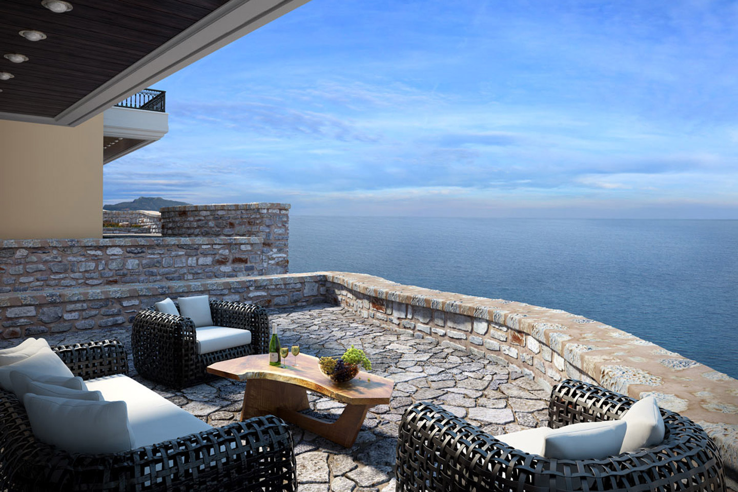 Εξωτερικά, οι ιδιωτικοί πέτρινοι προαύλιοι χώροι με την μαγευτική θέα στον Λακωνικό κόλπο θα σας ταξιδέψει στην μεσαιωνική εποχή των κάστρων ενώ η κάθε βίλα παρέχει ιδιωτικό δρομάκι το οποίο οδηγεί σε μία κρυστάλλινη παραλία, ιδανική για ατελείωτη κολύμβηση και αναζωογόνηση.
