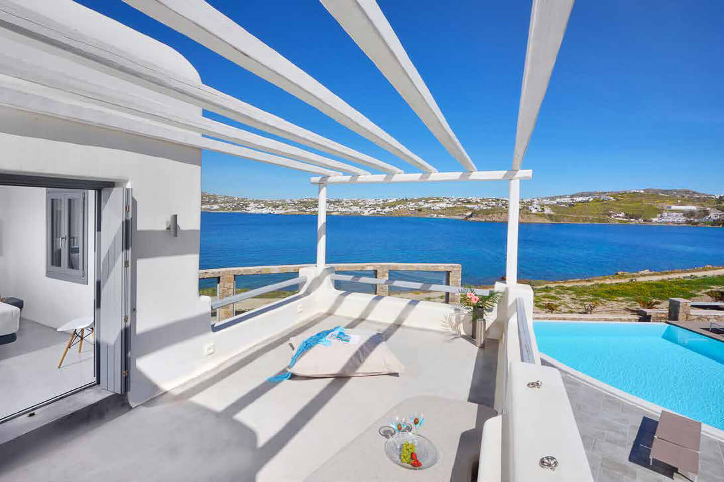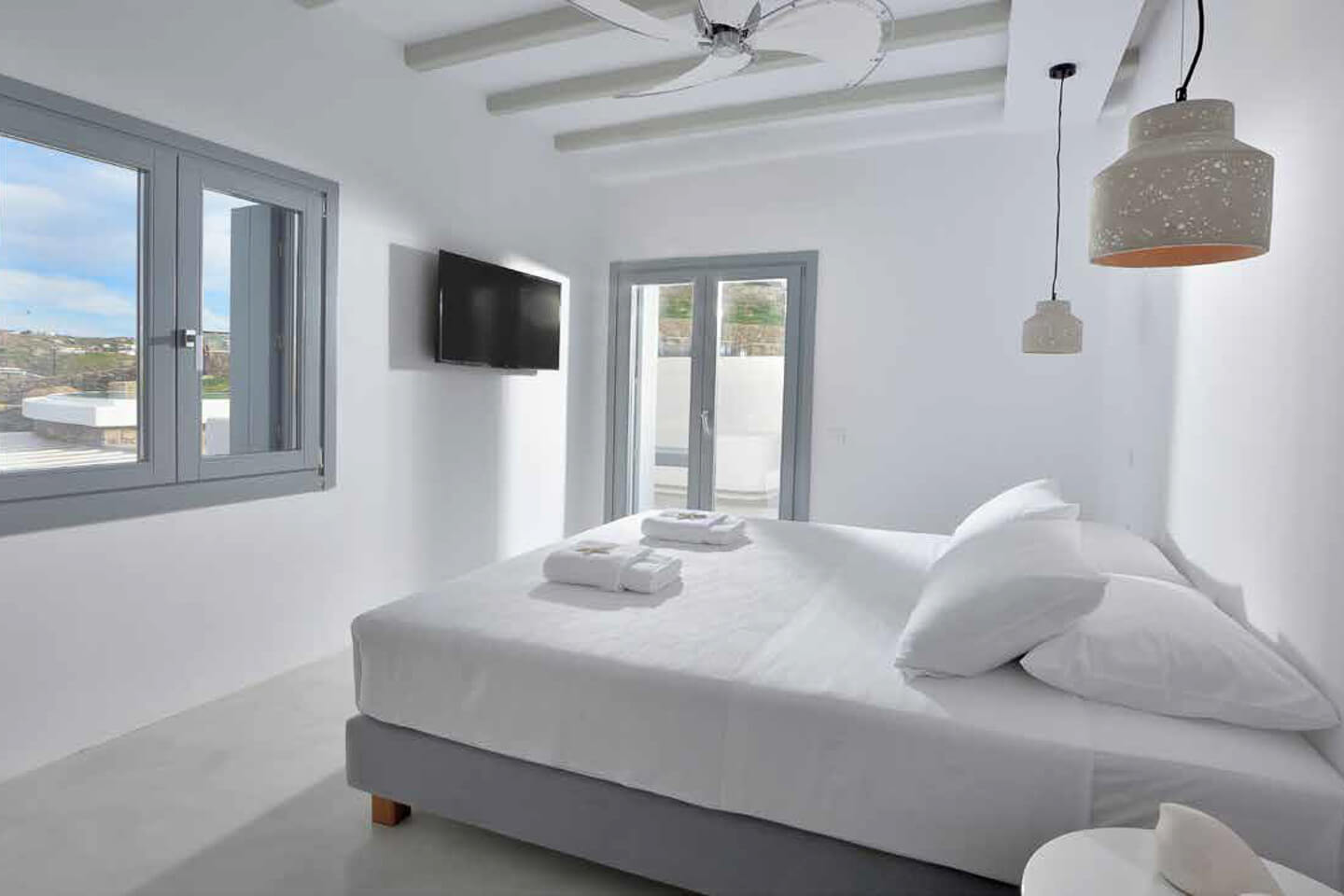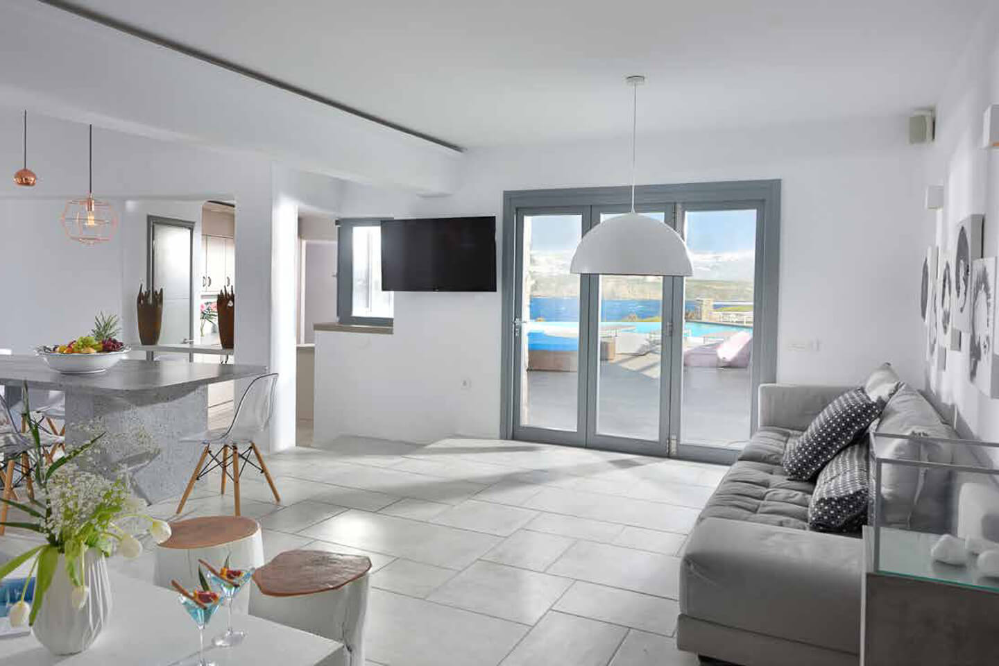 Η πολυτελής βίλα, χτισμένη σε εκπληκτική παραθαλάσσια τοποθεσία της Μυκόνου, βρίσκεται πολύ κοντά σε όλους τους κοσμοπολίτικους προορισμούς του νησιού, καθώς και σε μαγευτικές καταγάλανες παραλίες.
