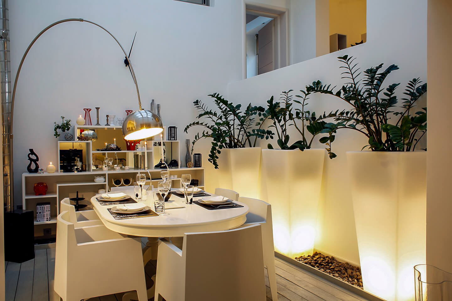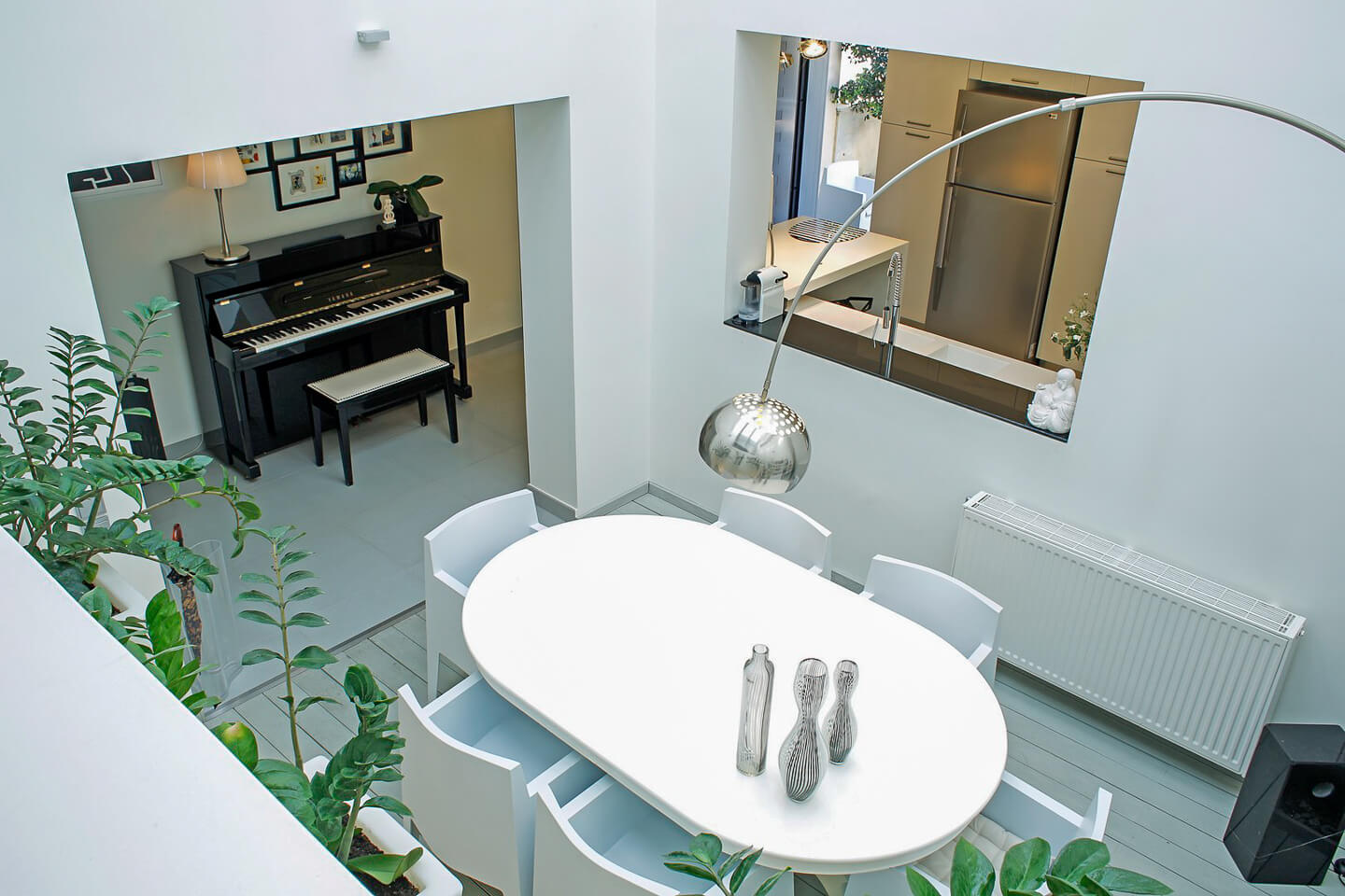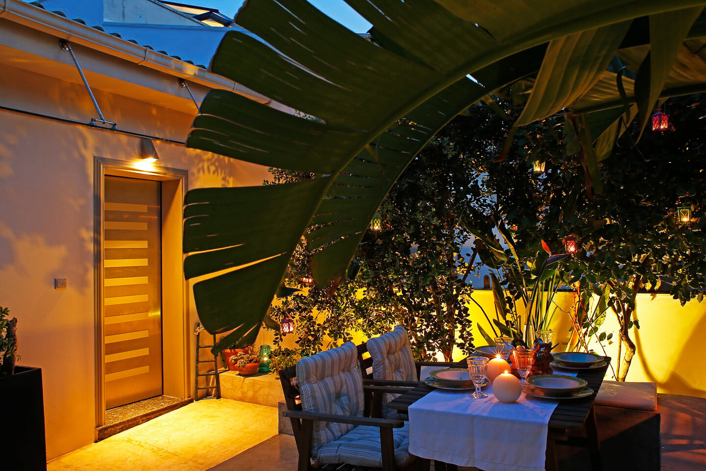 Υπάρχει ξύλινη βεράντα με ένα άνετο και μοντέρνο μεγάλο τραπέζι με 6 έδρες με έντονο φως που διαχέεται από τη γυάλινη οροφή.
